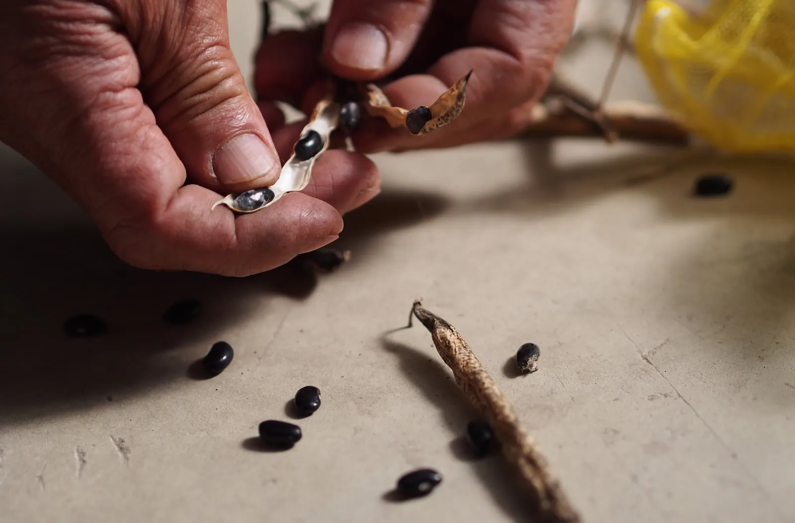 その日はこの原稿のためにいつもに増してお話をゆっくり伺わねばなりません。けれどインタビューが始まっても光治さんはじっと座っていません。こちらの質問に大きな声で答えながら、あちこちの袋を開け、黒豆や小豆やらを取り出して見せてくださり、それから裏の水場で種取り用のトマトを見せてくださり、これも種取り用のカサカサになったインゲンを見せてくださいます。