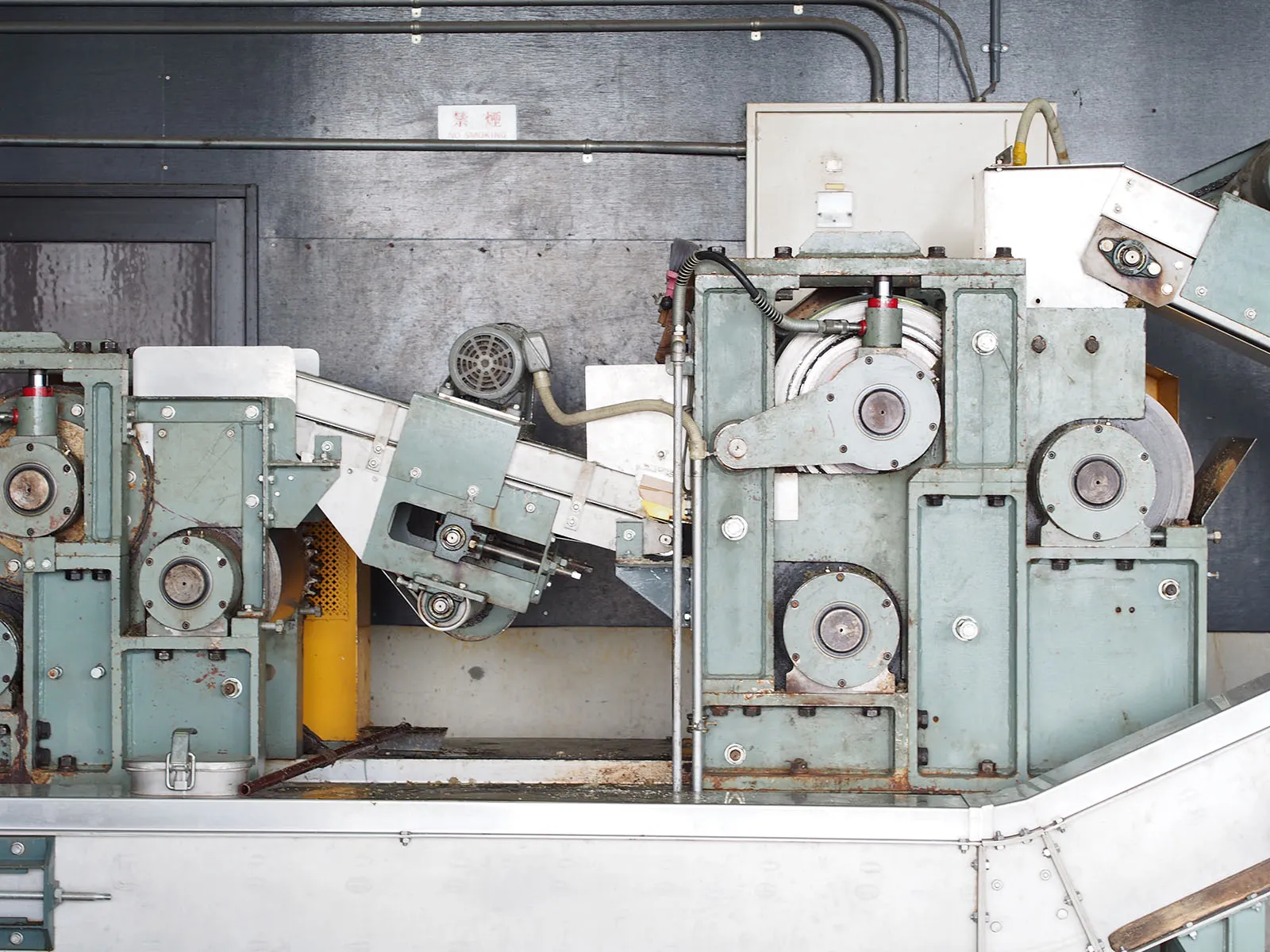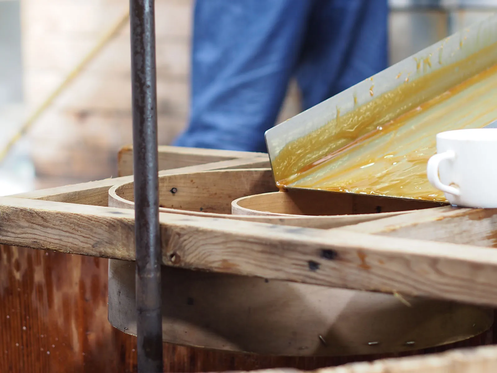 「いまは機械絞りですが、昔は牛が石のローラーを回してしぼっていました。基本の製法は変わりませんが、動力源は変化しています」