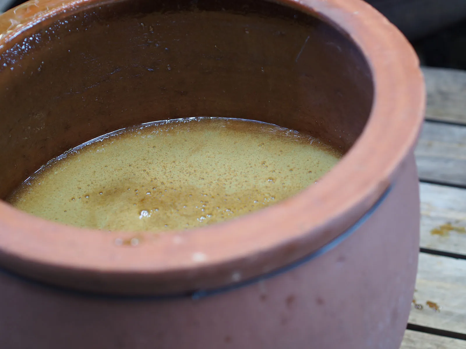 その後、木桶に入れて撹拌しながら冷まし、素焼きの壺に入れると、白下糖の完成です。白下糖は二か月以上寝かせて熟成させます。